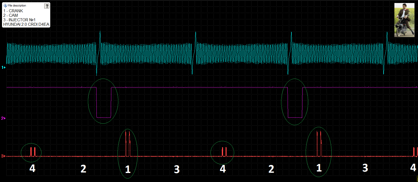 Речь - не об этом . В данном случае наводка - полезная. Наводка , которую видно , происходит при срабатывании драйверов форсунок. И каждое срабатывание драйвера , сопровождается большим скачком потребляемого тока. В результате , на выходе сигнала распред-вала отражается наводка. То есть в данном случае , наводка показывает - что есть управление форсунками. Клещи подключенные на провод форсунки ,будут намного информативней. Будет видно , и рабочий такт форсунки , и холостой такт :