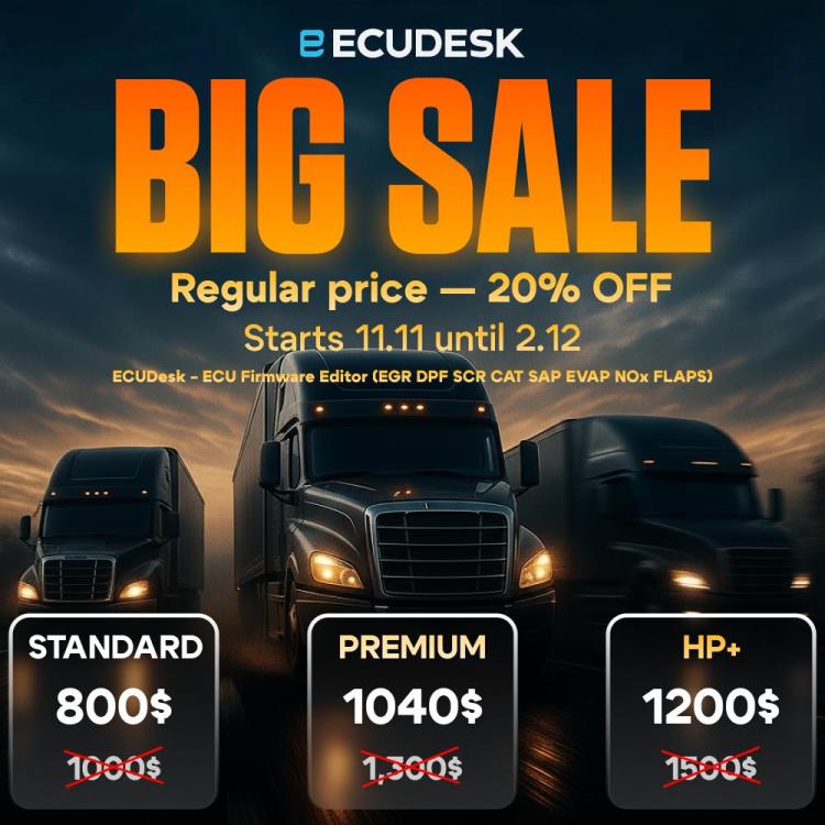 Привет парни, заметил в интернете, что вы обсуждаете наш ECUDesk! Решил внести ясности, для большего понимания. Это абсолютно не так, что чаще промахивается, у нас 100% рабочие решения. У нас очень отзывчивая поддержка и довольно быстрая, до 1 дня, но по факту ответ от поддержки до нескольких часов. Вот что мы добавили за последний месяц: DAF DELPHI DMCI (EGR SCR DTC) JCB BOSCH EDC17C01(DCU17) (SCR DTC) MERLO DENSO DC1U (EGR DPF SCR NOx DTC) VOLVO TRUCK EMS2 ACM (SCR DTC) DEUTZ BOSCH EDC17CV52 (EGR DPF SCR NOX DTC) KUBOTA BOSCH EDC17CV45 (EGR DPF FLAPS DTC) MERCEDES TRUCK CONTINENTAL ACM2.1 (SCR DTC) FUSO CONTINENTAL ACM2.1 (SCR DTC) VOLVO TRUCK CONTINENTAL ACM ATK E6 (SCR DTC) IVECO TRUCK BOSCH EDC17C49 (EGR DPF SCR NOx DTC) IVECO TRUCK BOSCH EDC7UC31 (DPF SCR NOX TVA DTC) VOLVO TRUCK TRW EMS2 E4 (EGR DPF SCR NOX DTC) MITSUBISHI (DCU17PC42)EDC17C01 (SCR DTC) Renault TRW EMS2 E4 (DIESEL) - (SCR DPF EGR NOX FLAPS DTC) Renault TRW EMS2.2 E4 (DIESEL) - (SCR DPF EGR NOX FLAPS DTC) Renault TRW EMS2.2 E5 (DIESEL) - (SCR DPF EGR NOX FLAPS DTC) Renault EMS2.3 E6 (DIESEL) - (SCR DPF EGR NOX FLAPS DTC) Renault EMS2.4 E6 (DIESEL) - (SCR DPF EGR NOX FLAPS DTC) SCANIA SIEMENS/CONTINENTAL EMS S7 (DPF EGR NOx DTC) SCANIA EMS S8 (DPF EGR SCR NOX DTC) SCANIA EMS EMD1 (DPF EGR SCR NOX DTC) KUBOTA DENSO ACM(SH72531) (SCR DTC) VOLVO TRW EMS 2.2 EURO5 (DPF SCR EGR NOx DTC) VOLVO TRW EMS 2.3 EURO6 (DPF SCR EGR NOx DTC) Кроме того, у нас гарантия возврата средств до 14 дней Ах вот еще забыл вписать VOLVO TRW EMS 2.4 EURO6 (DPF SCR EGR NOx DTC)