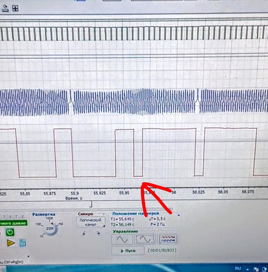 Вопрос к знатокам: подскажите почему на моей осциллограмме зубья задающего диска дпрв не такие как у всех после второго малого зуба маленький перерыв, у всех немного больше ( в осциллограмме разсинхронизация дпкв дпрв)