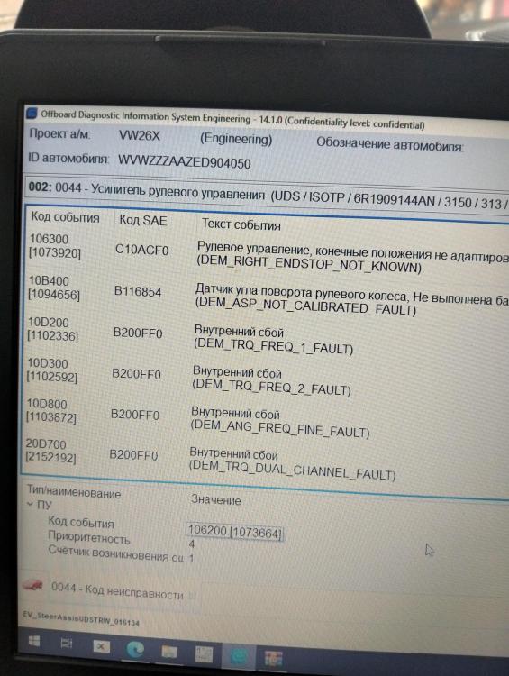 Здравствуйте. Может кто сможет подсказать или помочь удаленно (понятно не бесплатно) вопрос по возможности замени електроусилителя на e Up 14г. Установлен бил с номером 6r1909144an есть под замену 2q1909144r подкинул на фишки , руль стал гореть желтим но усилиния все равно нет( ошибки по адаптации крайних положений и положения руля. Также ошибка незапрограмирован по окончанию сборки. B201300, теперь задаюсь вопросом получиться ли вообще его подружить с авто? П.С. на фото ошибки с родного эур , прошивал и флеш и параметрию . Постоянно красний руль. Усилиния нет. Ошибки по внутреннему сбою появляються после того как покручу руль туда - сюда.. Спасибо.