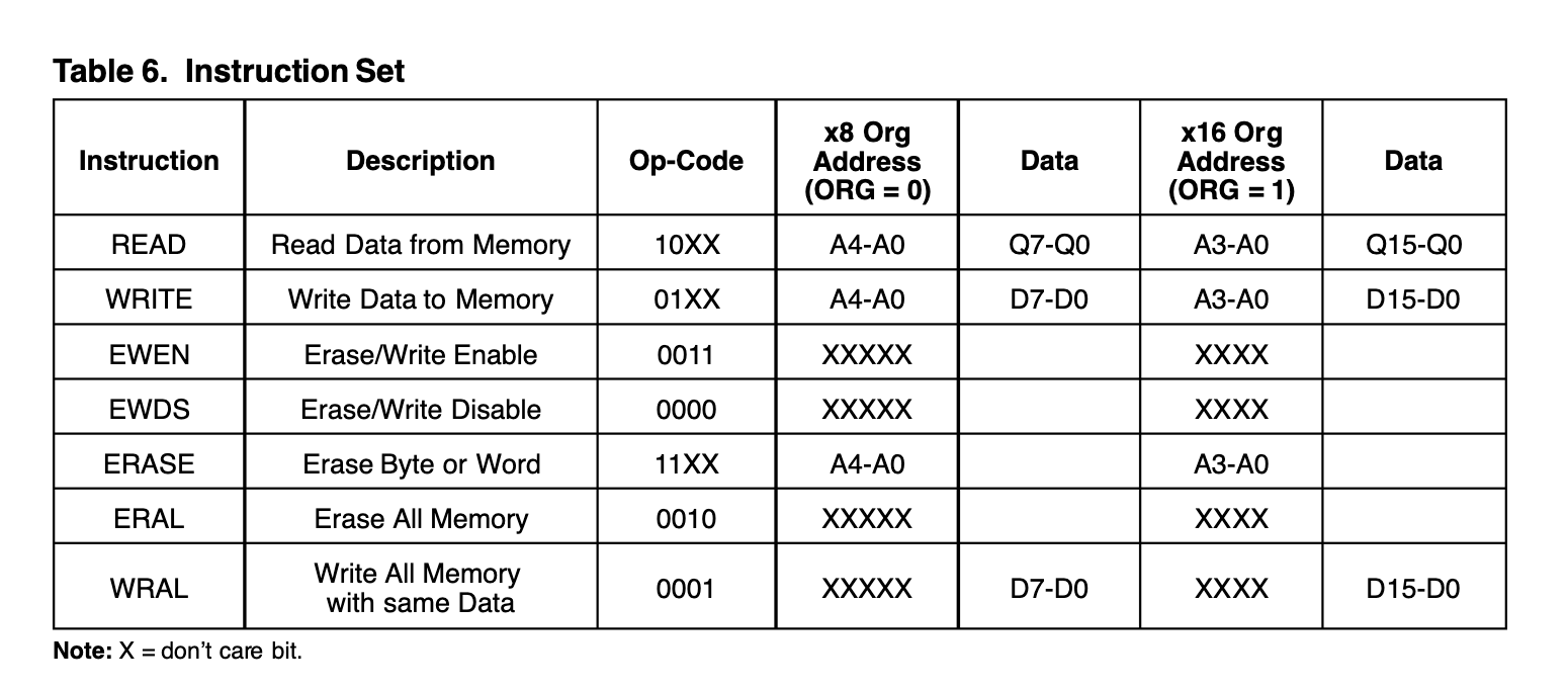 В зависимости куда подтянут ORG пин к земле или питанию - будет формат х8 или х16 Для отключения стирания/записи нужно выполнить опкод (0000) И на всякий случай, достаточночно существенная разница между 93с06 и 93с06с - для последней нужен дополнительный тактовый импульс, те если один чип заменить другим - будет сдвиг данных на бит