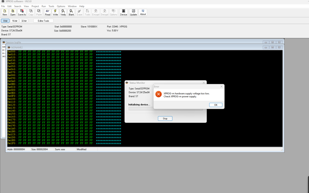 Здравствуйте, имею Xprog 6.50 с usb флешкой китай. Пользовался сей девайсом около года , вроде работала считывал и записывал несколько моторолл и eeprom, теперь при попытке считать что угодно, выдает такую ошибку XPROG-m hardware supply voltage too low. Check PROGG-m power supply. Питание пробовал подавать внешнее 15 вольт , безрезультатно, замерял на ножках Atmega все 5 вольт приходят, программа видит сам прибор но пишет, низкое питание. Может у кого есть схема именно Xprog 6.50, на 5.50 нашел но по железу он совсем другой, с ком портом и детали и компоновка другая , или может подскажет кто , что проверить?