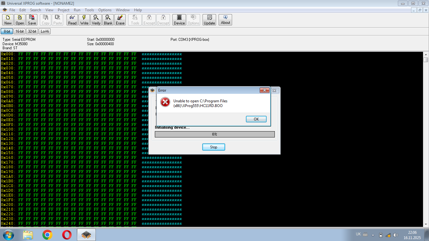 Всем привет. Нужен совет. На ноуте стоял Windows XP и установленная прога ХпрогМ 555, все работало много лет, теперь после смены на Window 7, установил Хпрог, драйвера. Прибор определяется, при нажатии на кнопку Reed засвечиваются диоды на приборе и выскакивает вот такое сообщение, сделал скрин.
