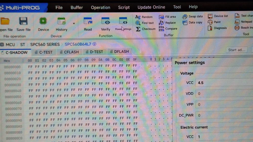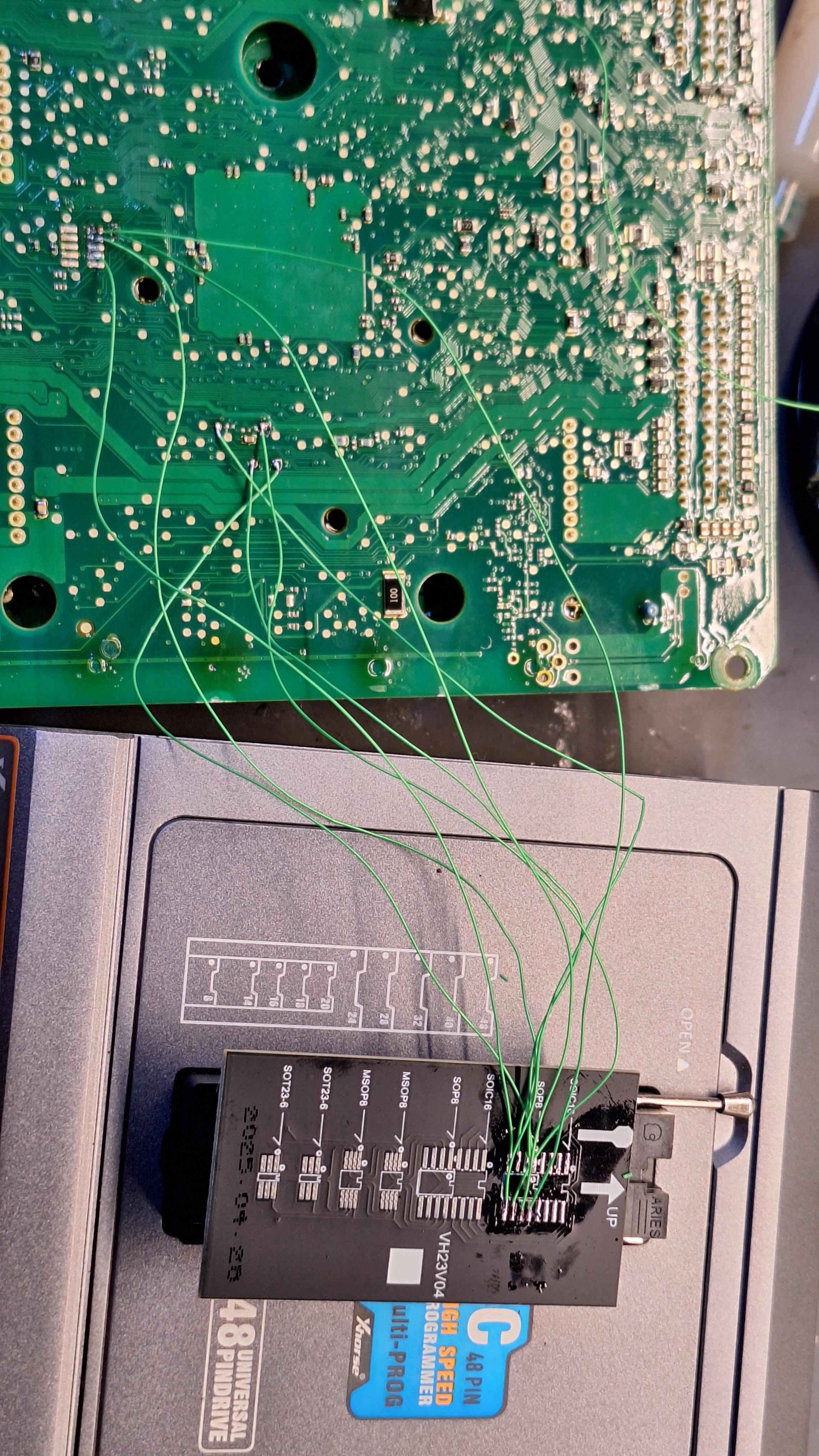 16. Gem Focus mk3, C-max mk2, без распаивания плат. Все что находил в интернете, не совсе совпадало с моим блоком, пришлось распаять. А раз распаял, то и вызвонил. 3 и 8 нога еепрома, сидит на vcc. Остальные, разбросыны по плате. Проц, читаеться с плащадки. Питание и масса, подходит на сдвоенные контакты, не обязательно их спаивать как сделал я. Но толстые провода так проще и безопаснее на отрыв площадок. Читаем ееепром и C flash. Интерфейс, ругаеться на неизвесный проц и еепром. Руками ставим питание 4.5в