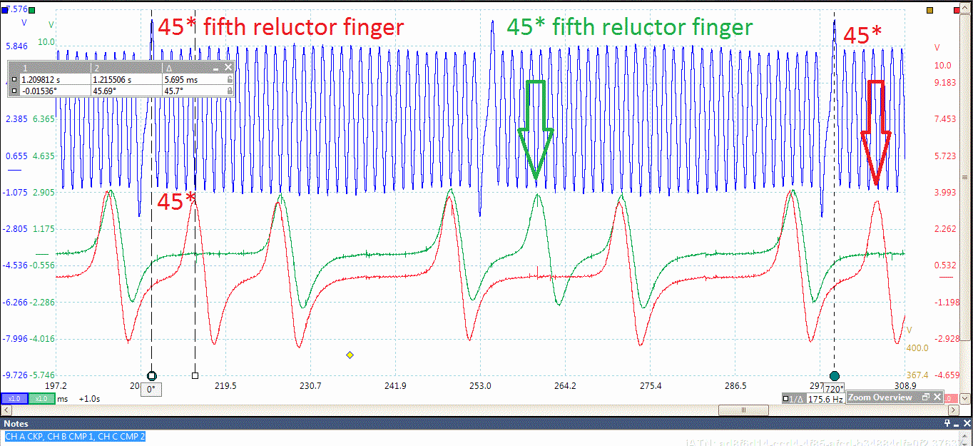 serguei 52 Опубликовано 25 минут назад Автор Поделиться Опубликовано 25 минут назад 55 минут назад, васек р сказал: Сканер показывает , что всё - криво. Механик утверждает , что всё - ровно. Вот про это я и пишу. Мотор был собран, потом разобран и и метки были проверены дважды после этого. Я при этом лично присутствовал, видел, и уверен, ВСЕ метки выставлены правильно. В ВМТ первого цилиндра (и по проверке через свечное отверстие, и по метке шестерни коленвала) выступ CVT смотрит четко на ДПРВ. А вот почему сканер показывает такой разбег (так это видит ЭБУ по сигналам с датчиков, из процессора), вот это и непонятно. За осциллограмму спасибо. Видимо, дальше придется смотреть осциллографом и делать выводы. "fifth reluctor finger" на осциллограмме, это пятый слева направо, если смотреть на VCT? Или справа налево, по направлению вращения? Ссылка на комментарий Поделиться на другие сайты Поделиться